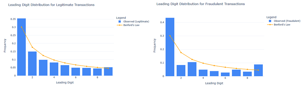 benford_probabilities = np.log10(1 + 1 / np.arange(1, 10))Next, we have to calculate the distribution of leading digits for the legitimate and fraudulent subsets of the dataset. To do this, it is essential to extract the leading digit of the ‘Amount’ column for each transaction.
