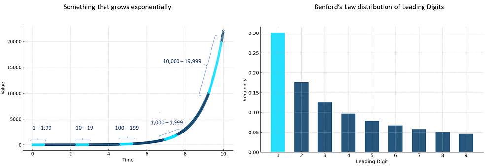 But why does this happen? 🤨 Many real-world phenomena grow proportionally —financial data like stock prices or interest rates, or population sizes, often grow proportionally or exponentially. This exponential growth leads to datasets whose leading digits inherently fit a logarithmic distribution. This happens because of the logarithmic spacing of numbers. For instance, on a logarithmic scale, the interval between 1 and 10 is much larger than the interval between 90 and 100. As a result, numbers with smaller leading digits — like 1 — appear more frequently, aligning with Benford’s Law. On top of this, random natural phenomena like the river lengths or lake sizes, generally follow highly skewed distributions that align with logarithmic spacing.